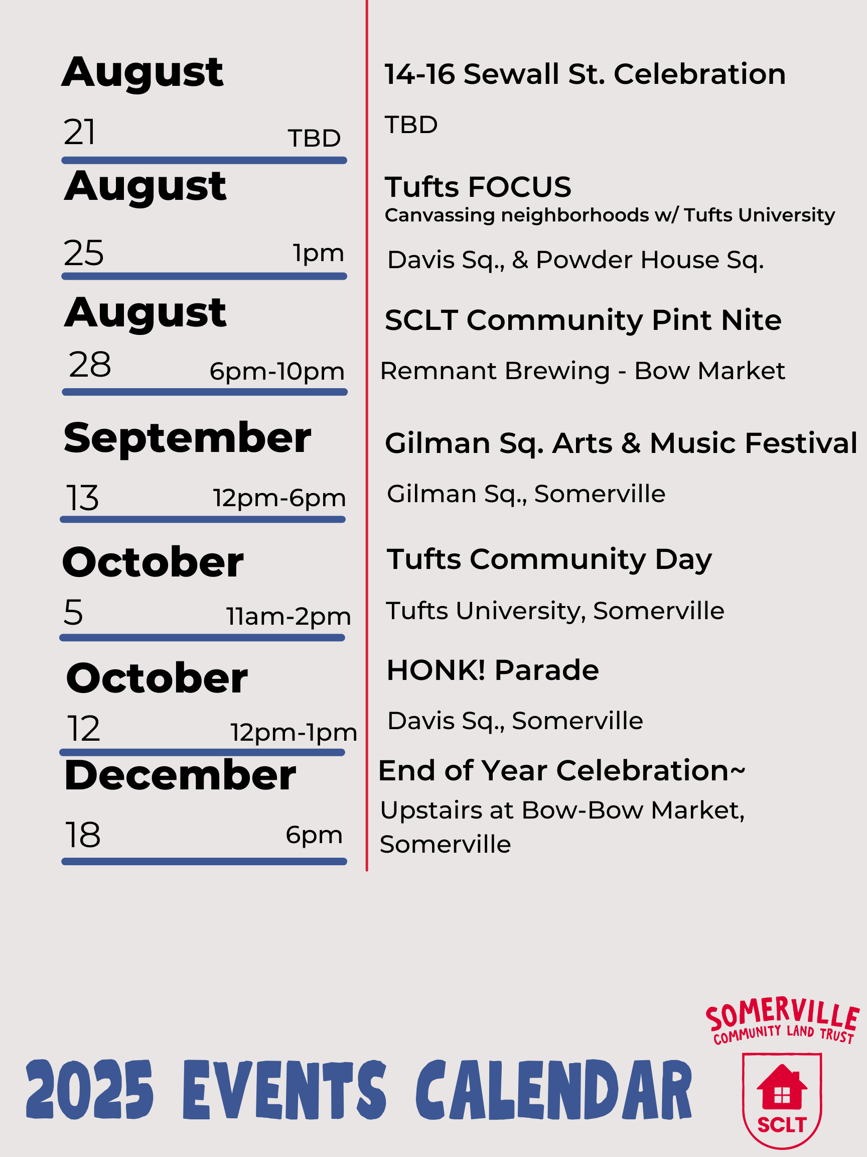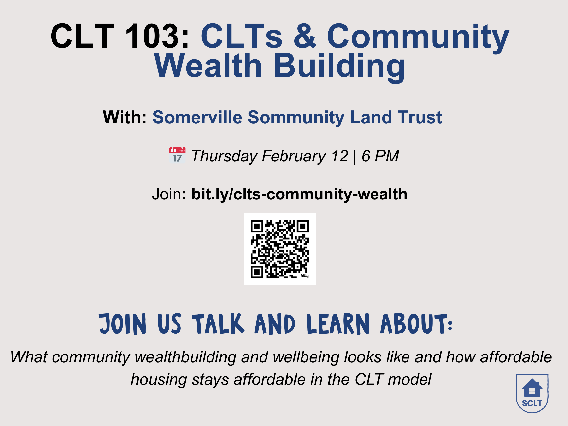 Click here to join Somerville Community Land Trust (SCLT) on Zoom at 6PM, Wednesday February 19, 2025.