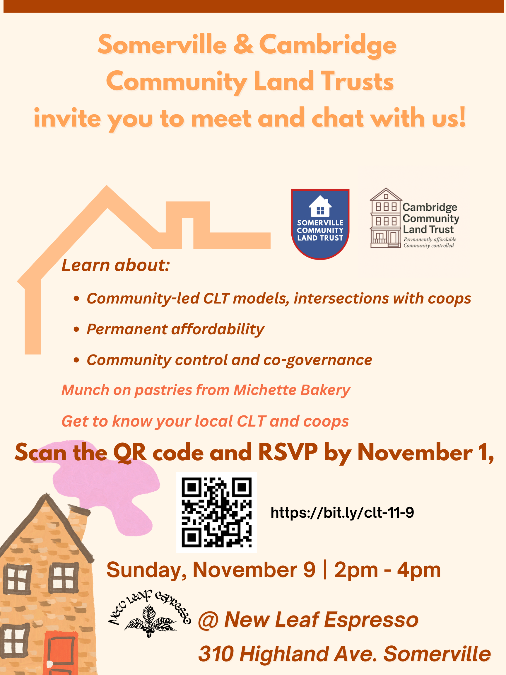 Click here to become a member and join the SCLT community! Membership is free and only requires you to be a Somerville resident. Make your voice heard in the organization’s leadership by voting and running for the Board of Directors scheduled for December 18, 2025. There will be three open seats for our Somerville Resident Representatives and three open seats for Public Interest Representatives (community leaders, representatives from local nonprofits and businesses).